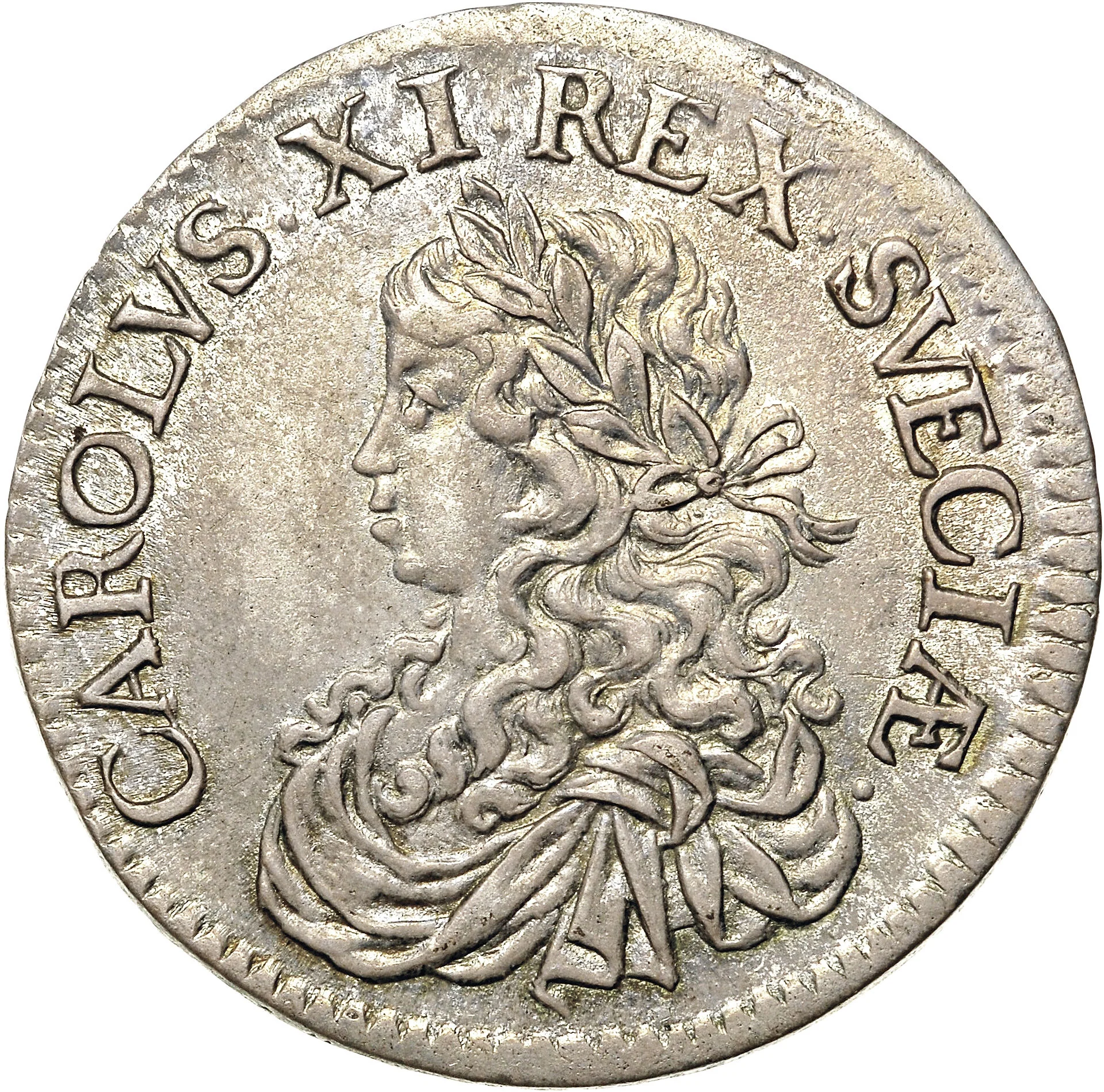 Young Laureate bust of Carl XI facing left, with lettering around the rim. Types vary by bust size, hair detail, and legend continuity/division.