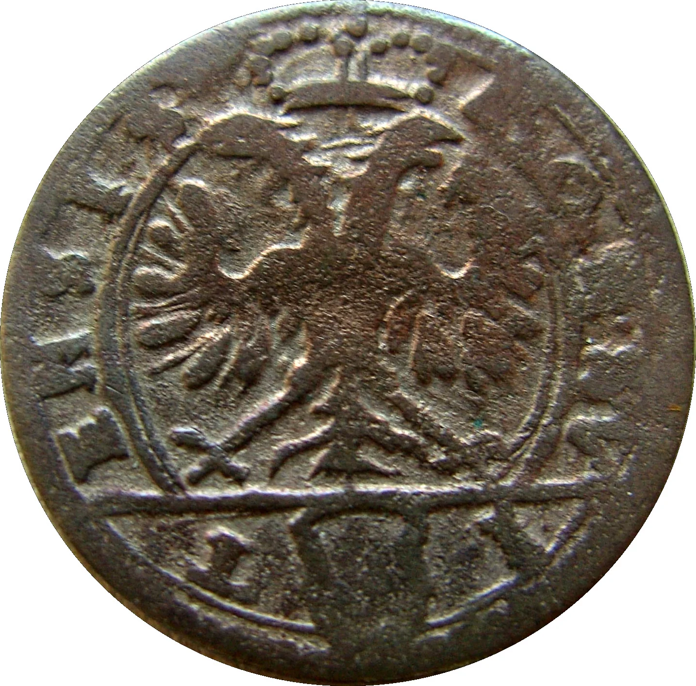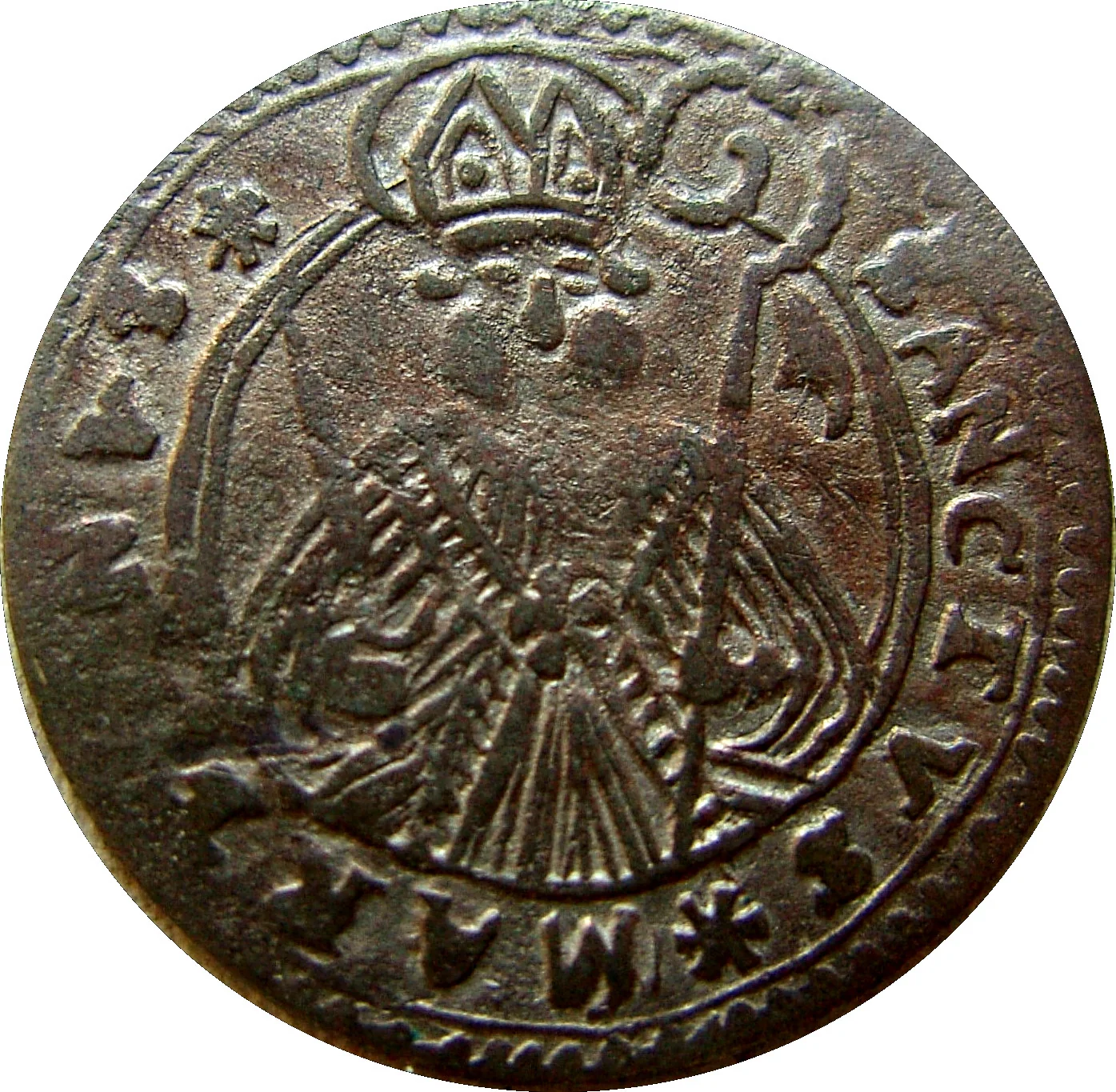 Imperial double-headed eagle above legend. Below, a shield divides "I T" with no date.