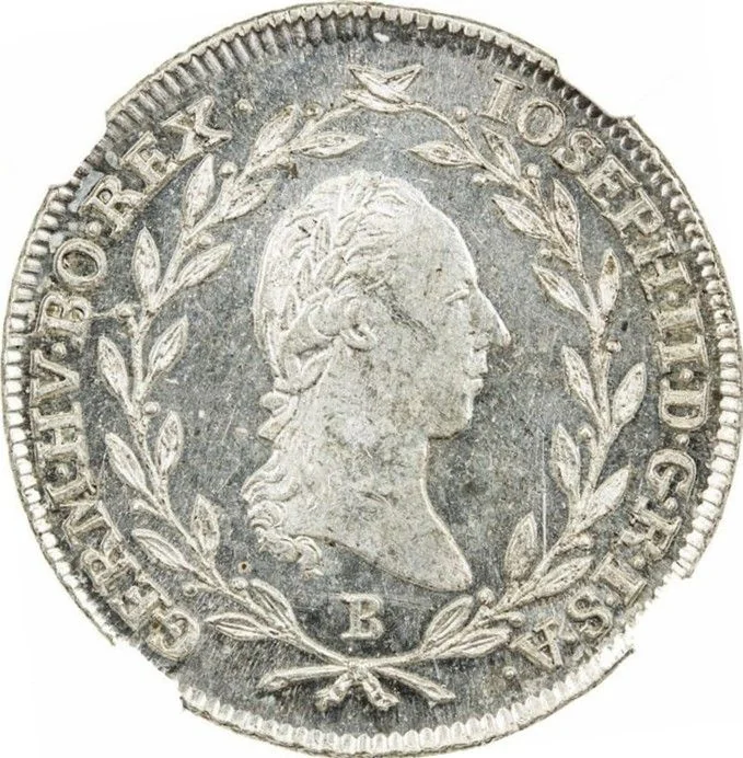 Joseph II portrait right in wreath, mint mark below. Legend surrounding.