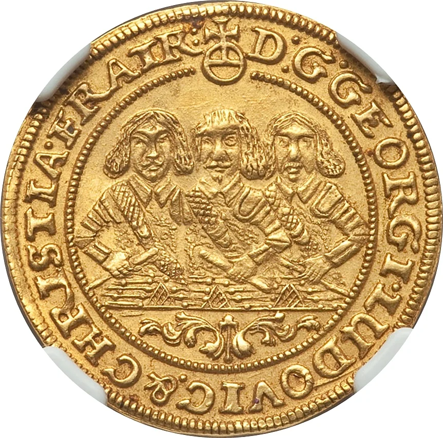 Armored busts of Georg, Ludwig, and Christian; imperial orb above, arabesques below.