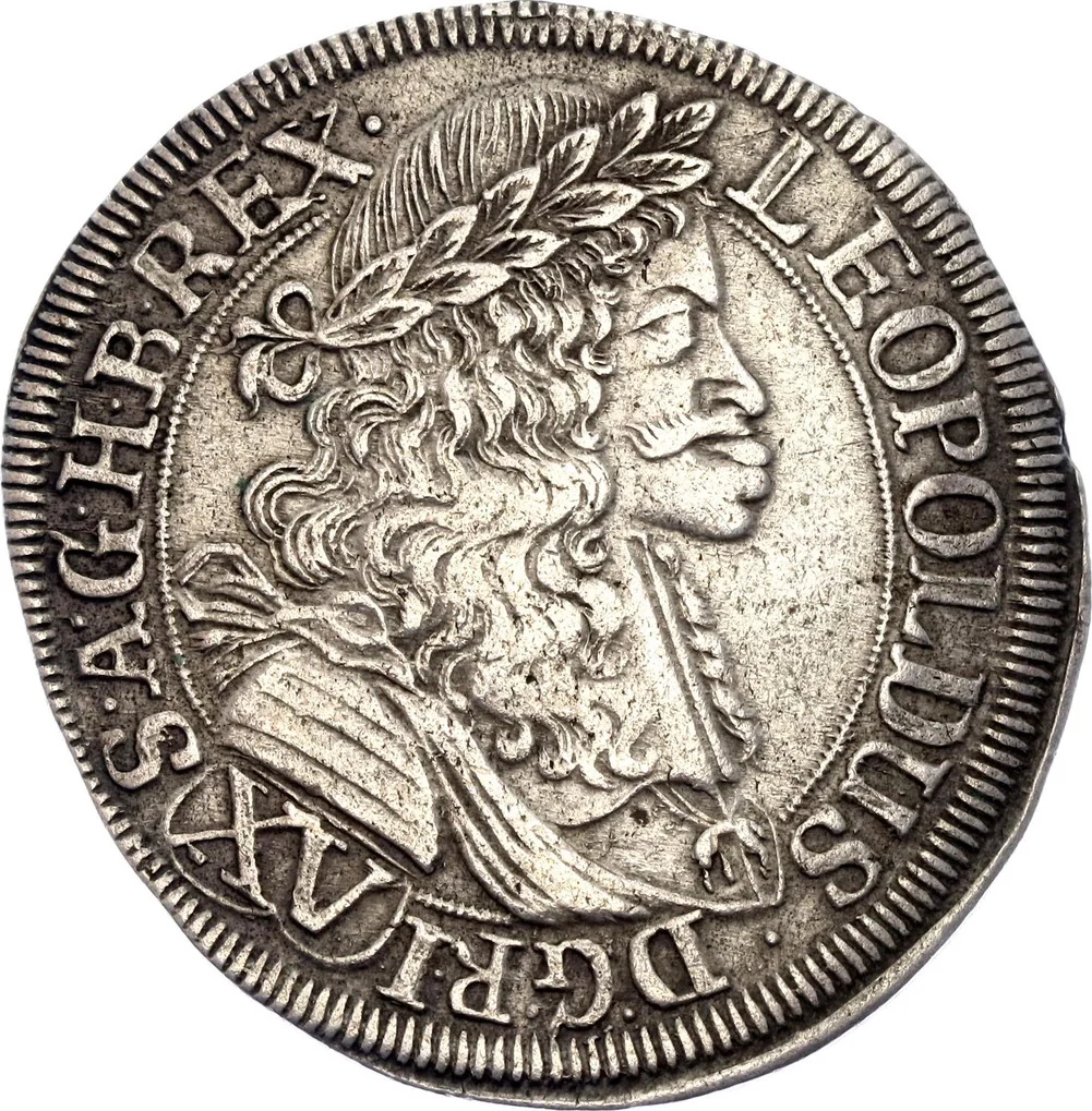 Portrait of Leopold I facing right, with curly wig. Legend above: "LEOPOLDUS DEI GRATIA ROMANORUM IMPERATOR SEMPER AUGUSTUS GERMANIAE HUNGARIAE BOHEMIAE REX." Value in Roman numerals below bust.