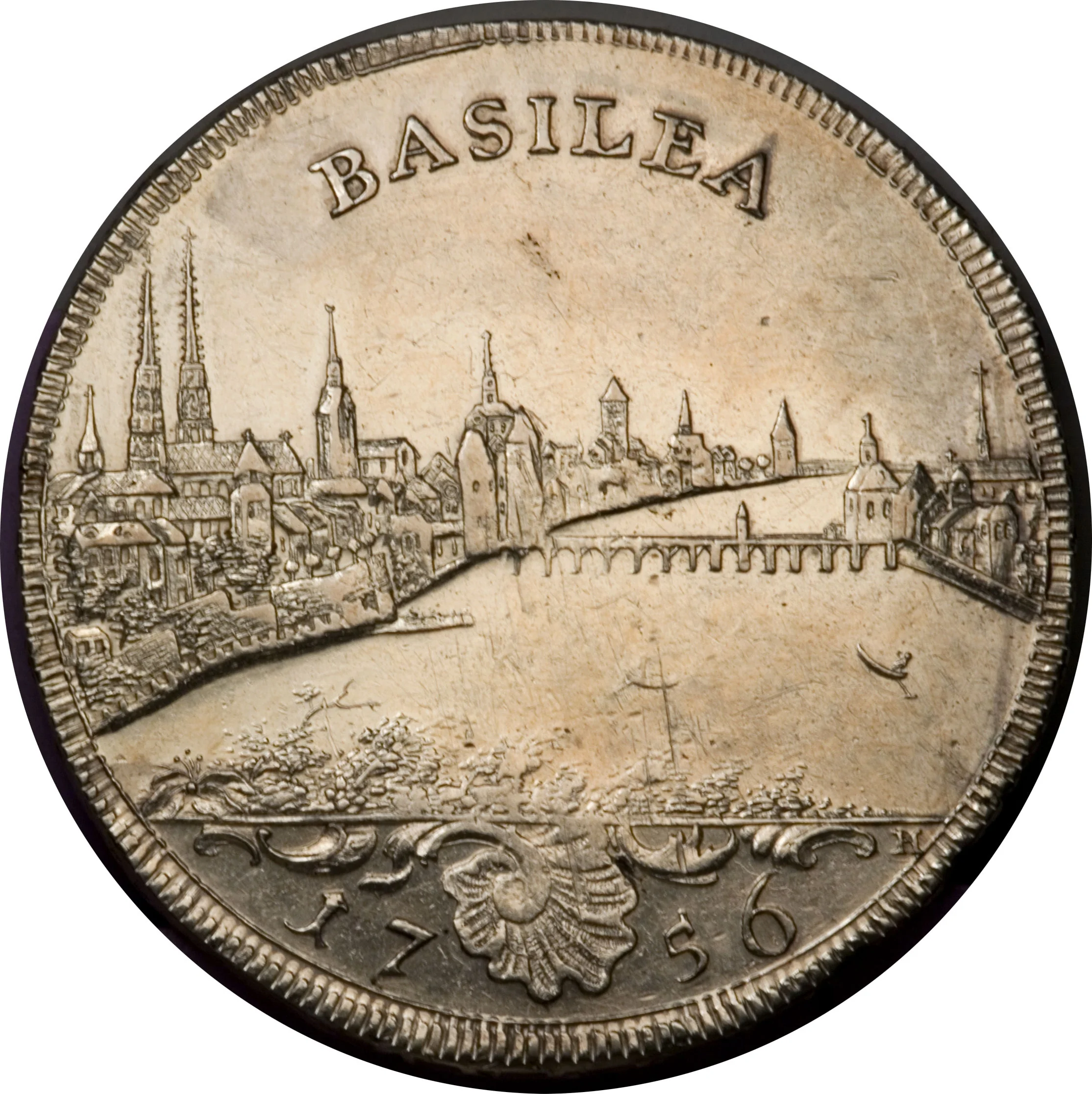 Basilisk facing right, Basel arms at lower left.