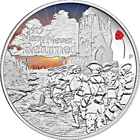 Australian soldiers returning to Ypres through the Menin Gate, passing the Cloth Hall. A red poppy is visible.