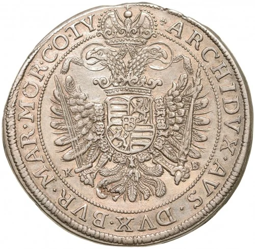 Imperial eagle in circle, crown above date, K B mintmark split by tail. U-shaped cartouche with crowned quadripartite shield (Árpád stripes/Bohemian lion). Central shield with uncrowned Austrian and Burgundian arms.