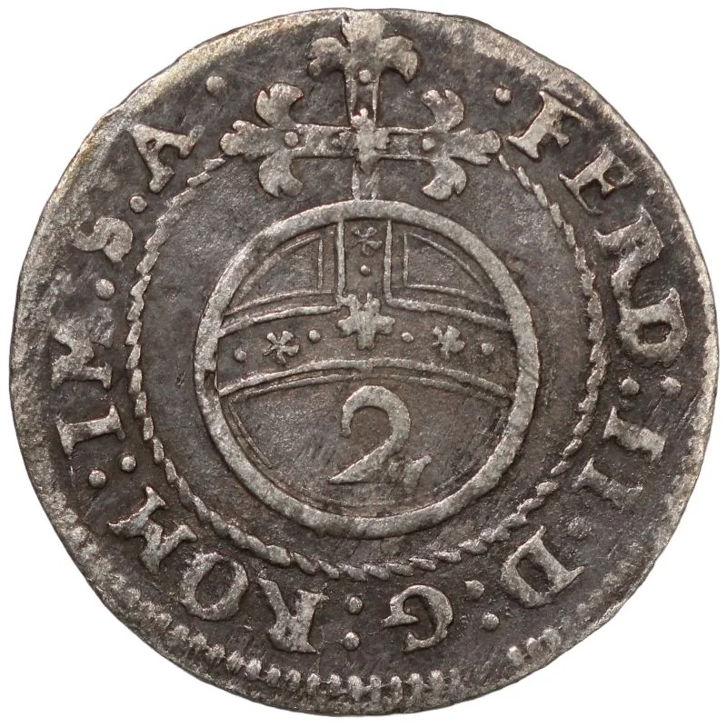 Imperial orb divided by a line, with value in center. Legend: "Ferdinand II Dei Gratia Romanorum Imperator Semper Augustus."