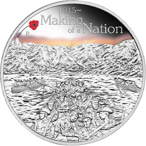 Australian troops row toward Gallipoli's rugged shore, a red poppy in the corner.