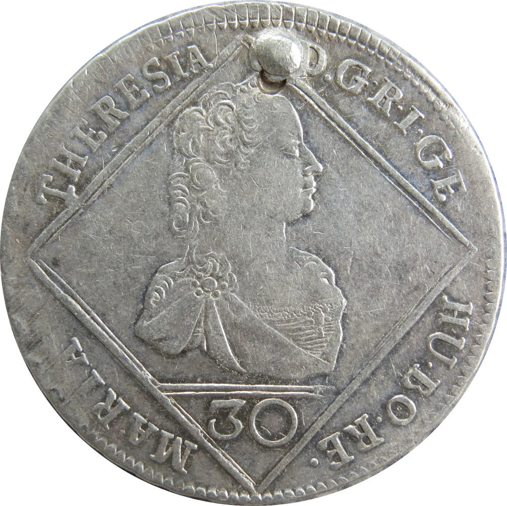 Right-facing portrait of Maria Theresia of Habsburg in a rhombus, value below. Circular legend: "MT Dei Gratia Romanorum Imperatrix Germaniae Hungariae Bohemiae Regina".