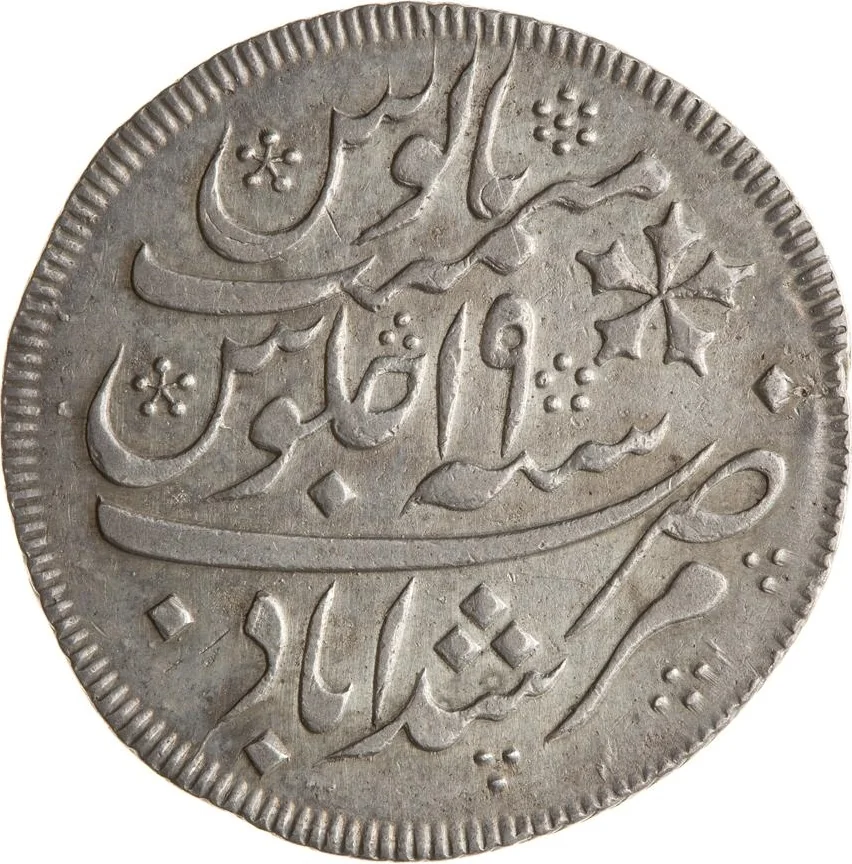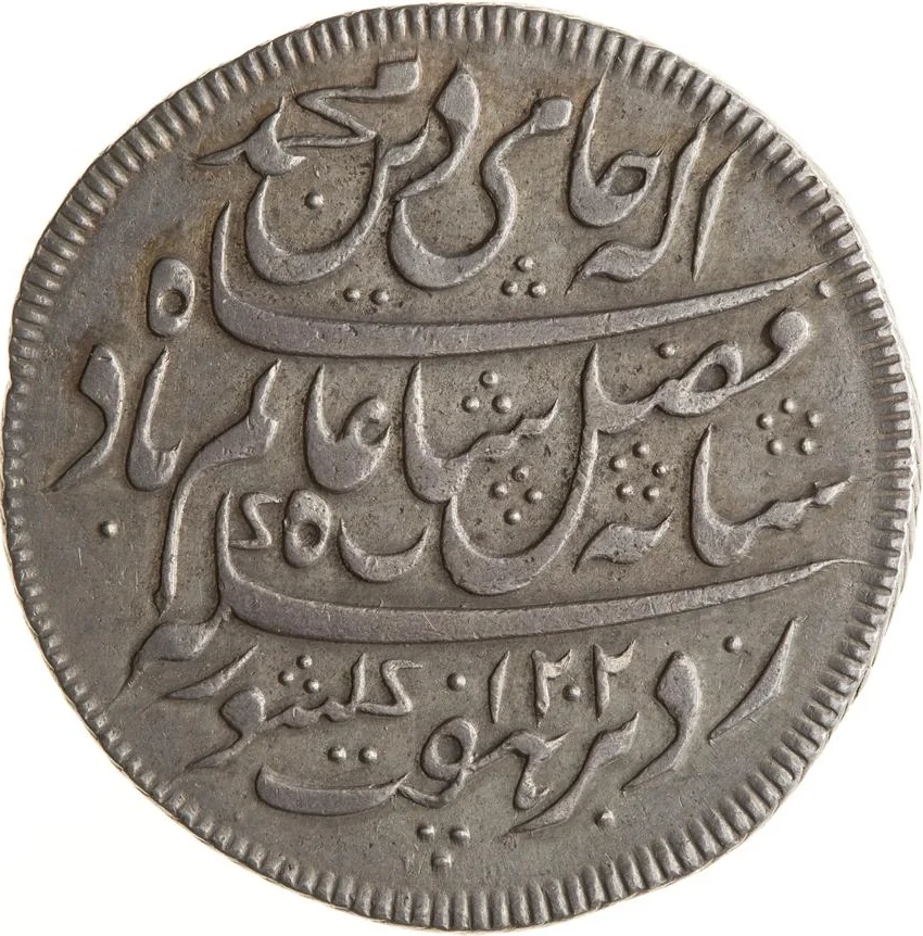 Minted across seven realms by divine grace, protector of faith Muhammad Shah Alam, Emperor, AH 1202.