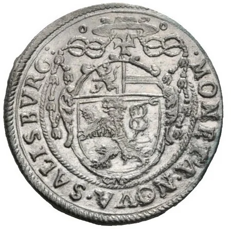 Archbishop’s hat over an oval shield with arms of Salzburg; legend surrounding.