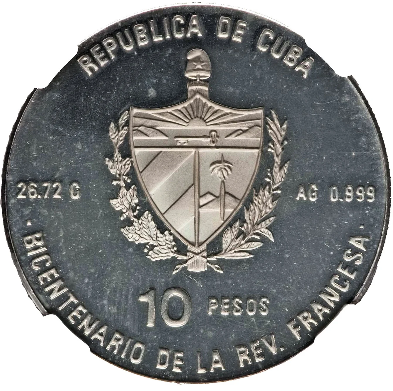 Cuban coat of arms with country name above, face value below, weight and fineness at sides, and a circular commemorative legend at the bottom.