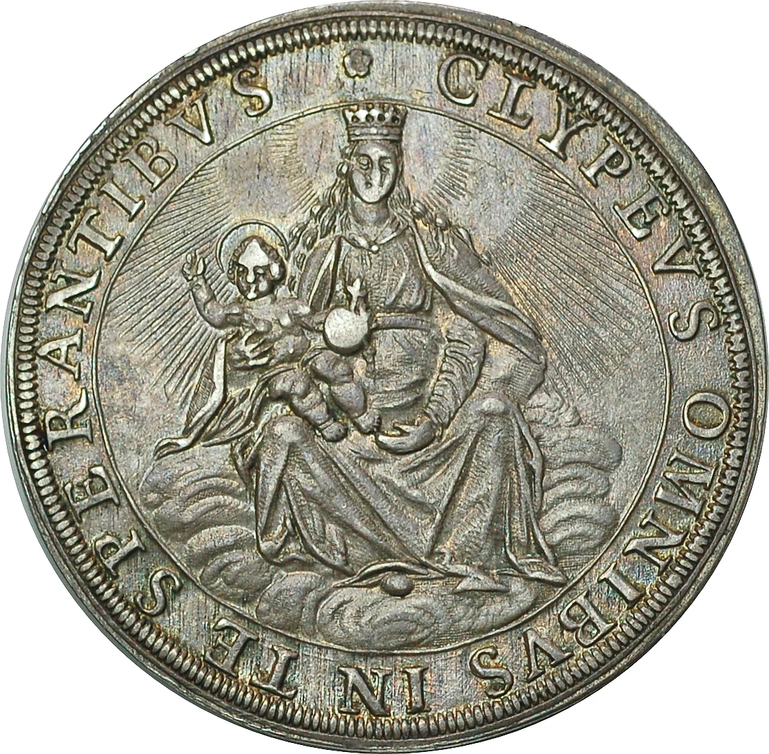 Seated Madonna on clouds, holding Child at left, with radiant beams behind.
