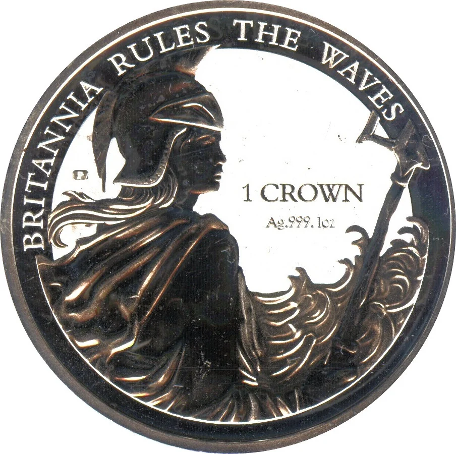 Side portrait of Britannia with trident. Lettering around edge, value and metal to her right above waves. Raised land with embossed "P" to her left.