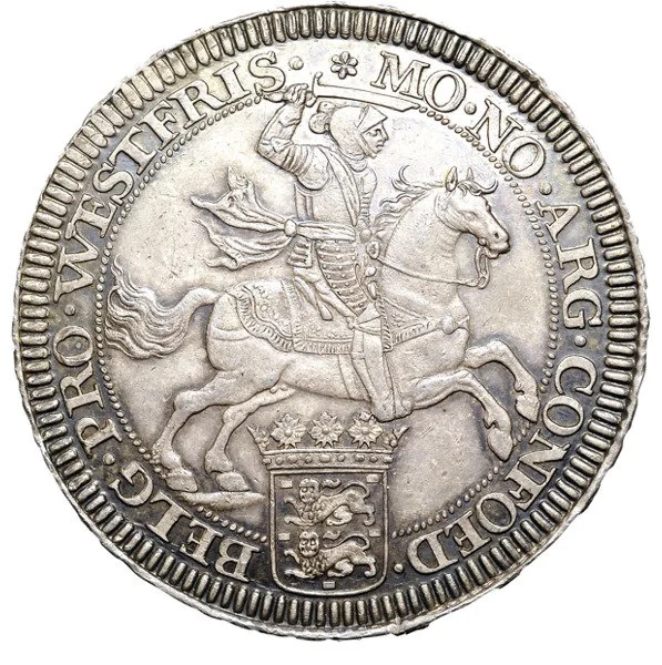 Knight on galloping horse right within beaded circle, crowned West Friesland arms below.