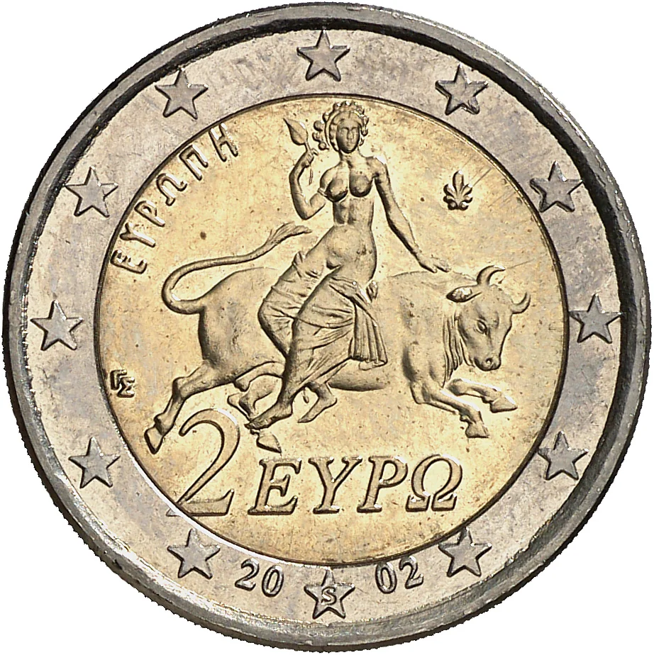 Depicting the myth of Europa's abduction by Zeus as a bull, the coin features the name "Ευρώπη," its face value, and the twelve European stars.