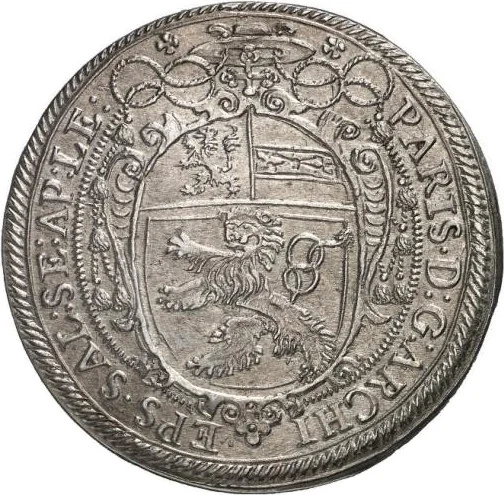 Oval shield under a cross and cardinal's hat. Top: arms of Salzburg. Bottom: archbishop's arms. Legend around, divided below by ornaments.