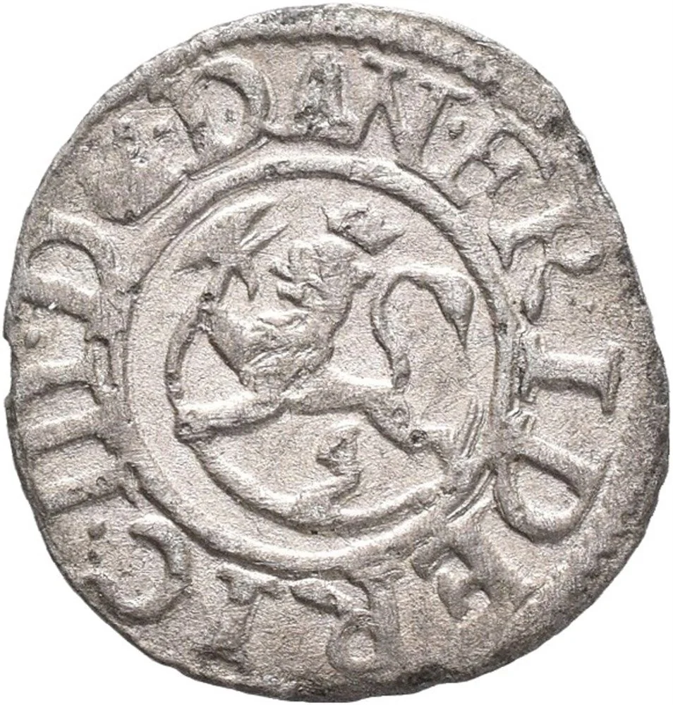 Crowned lion left with axe in solid ring, inscription around. Beaded rim.
