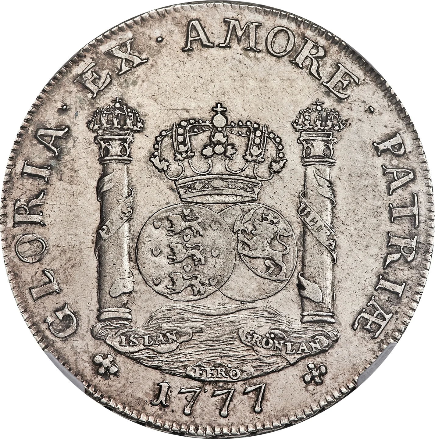 Danish and Norwegian crowned globes between pillars, inspired by Spanish 8 reales coins, above a mound with banners for Greenland, Iceland, and the Faroe Islands.