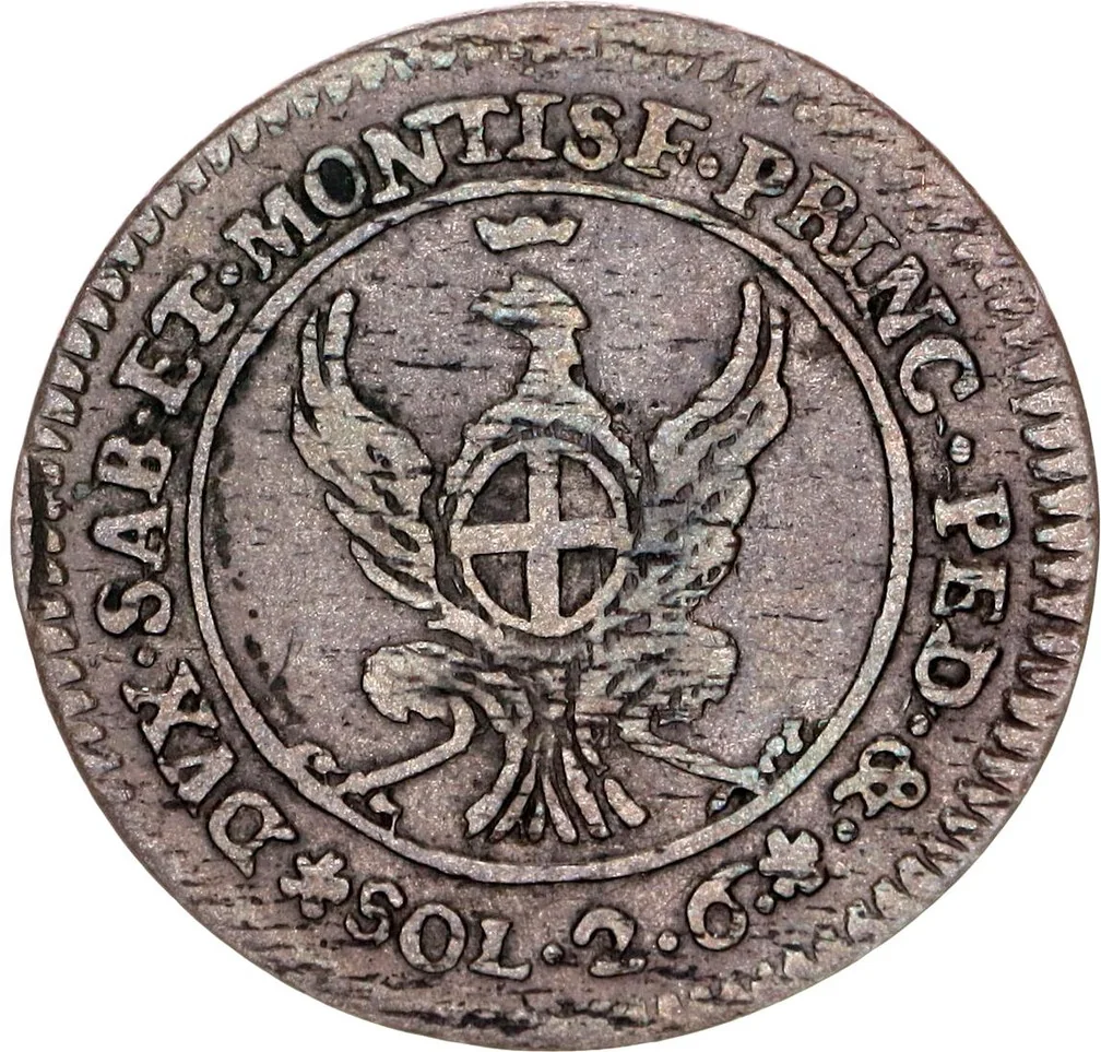 Crowned eagle with Savoy shield on breast, encircled, "SOL.2.6" below.
