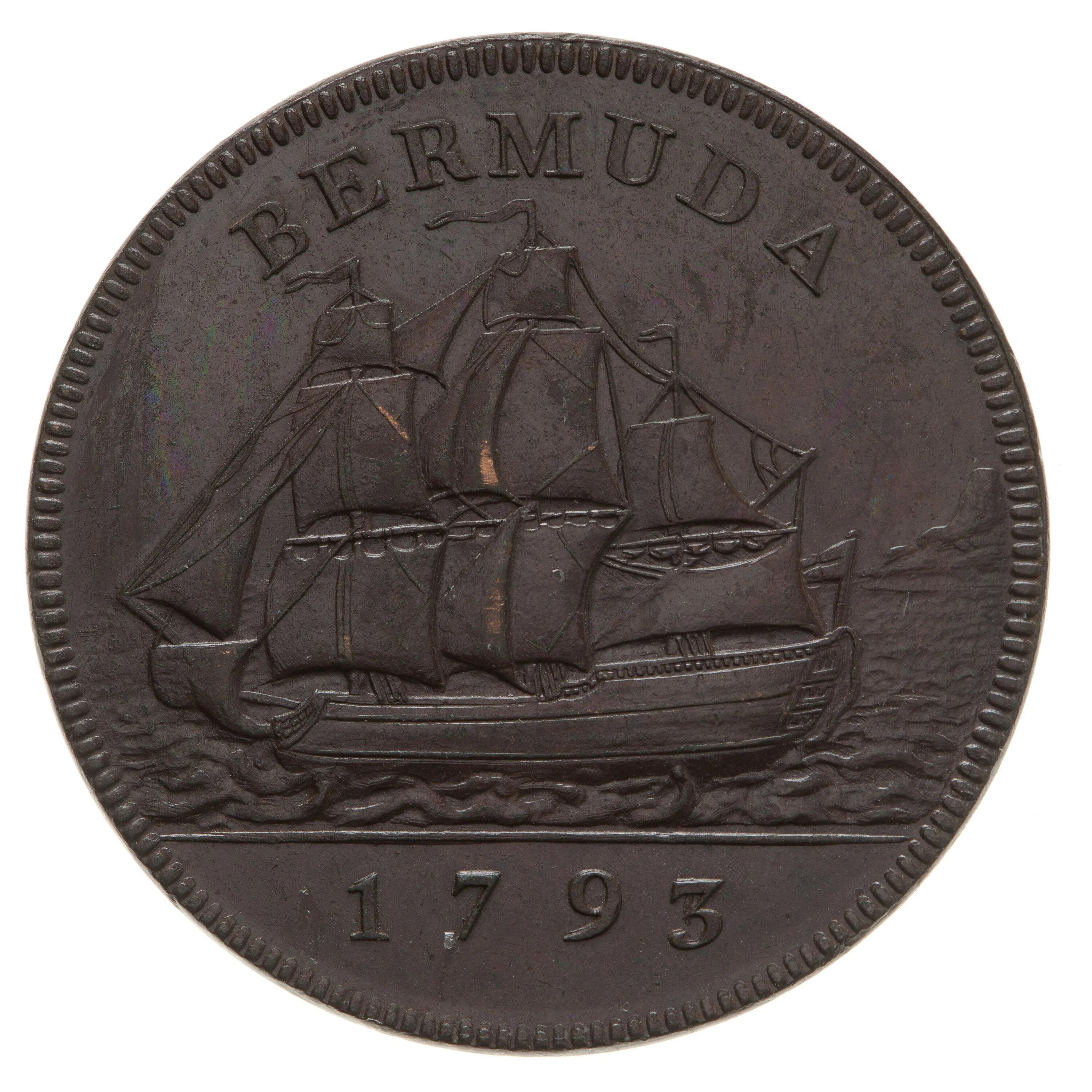 A sailing ship with land on the right horizon and "Bermuda" above. The line behind the third mast is a die clash—the King's neckline from the obverse—indicating it occurred early in production.