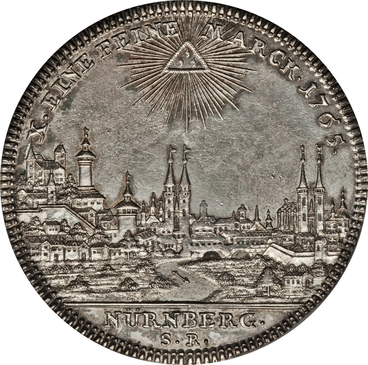 City view under a radiant triangle. Legend above, city name and mintmark below.