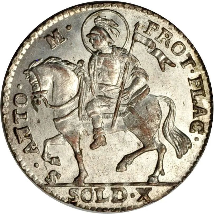 Saint Antoninus on horseback left, holding pennant; value below.