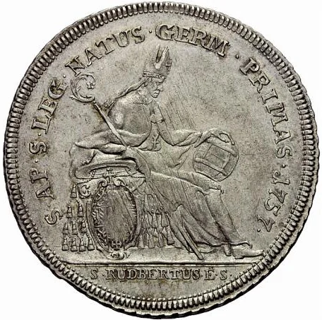 St. Rupert facing right, holding a crozier and saltbox. Beside him, his archiepiscopal hat and family arms. "St. Rupert" inscribed below.