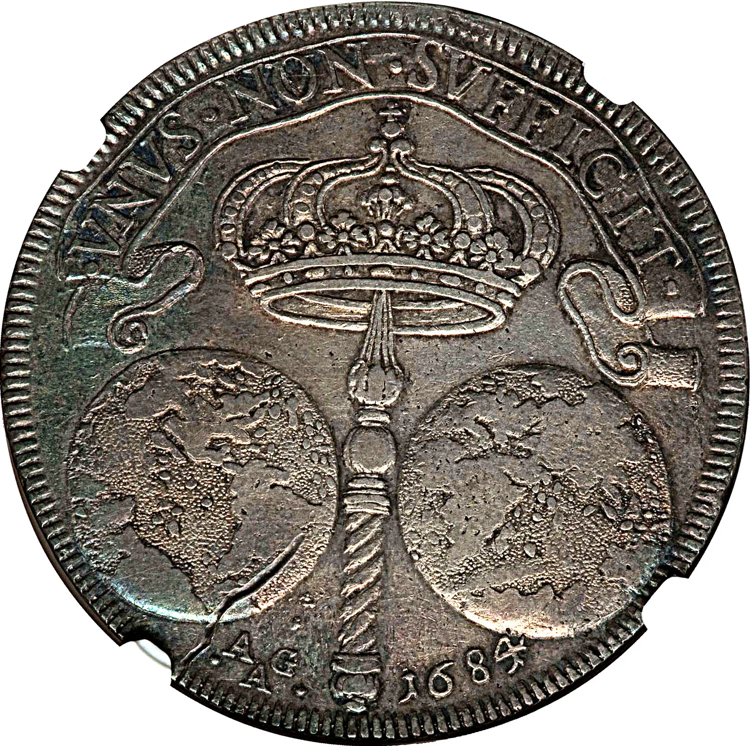 Scepter between two globes, mintmark left and date right, with ribbon inscription above.