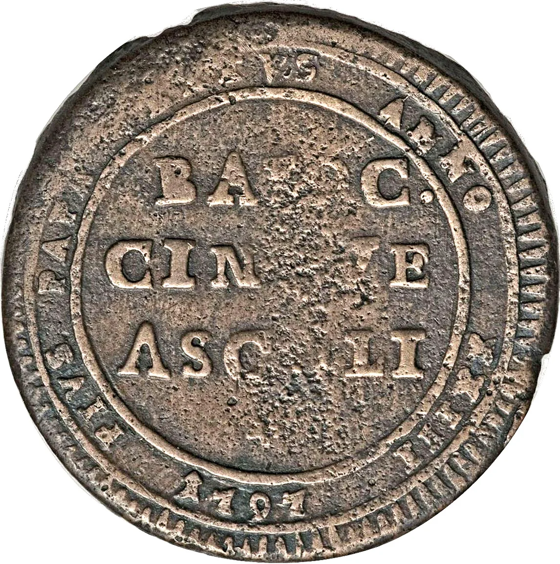 In 1797, the city of Ascoli Piceno, like much of central Italy, was caught in the turbulent wake of the French Revolutionary Wars. Following Napoleon Bonaparte's invasion of the Italian peninsula in 1796, the old political order was dismantled. The Papal States, to which Ascoli belonged, were forced into the Treaty of Tolentino in February 1797, ceding territory and paying heavy indemnities. This political upheaval directly destabilized the monetary system, as French authorities began to impose their financial demands and introduce new revolutionary currency alongside the existing, now-devalued, Papal coinage.