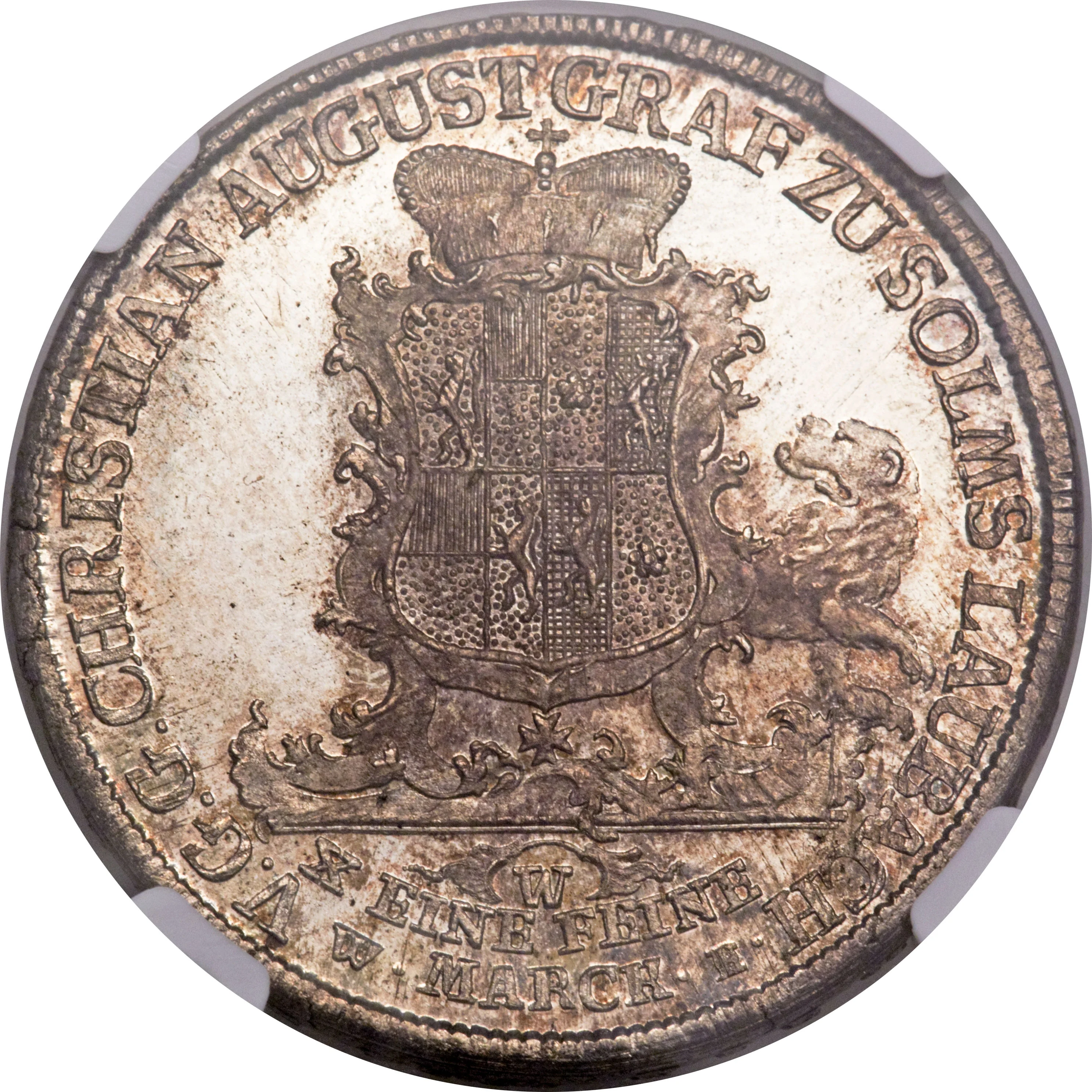 Crowned Rococo arms with a lion rampant.