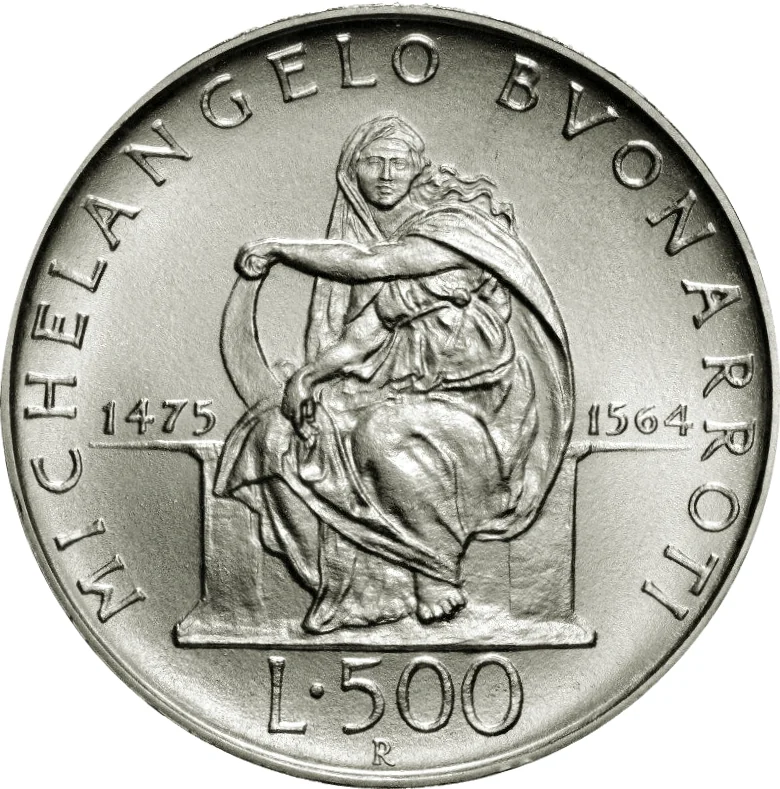 The Delphic Sibyl (Sistine Chapel ceiling) with Michelangelo's birth and death dates flanking the figure. Below, the value and mintmark.