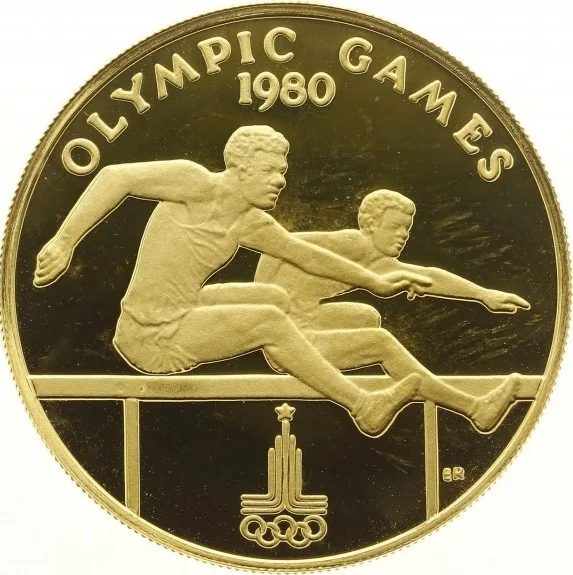 Two hurdlers, date below, Moscow Olympic logo beneath.