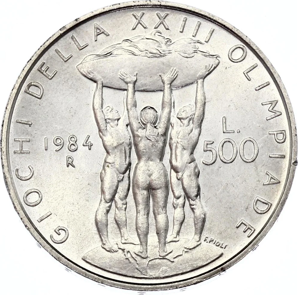 Three athletes supporting the Olympic flame on a globe. The value is on the right; the mintmark and year 1984 are on the left. The engraver's name is on the globe's rim.