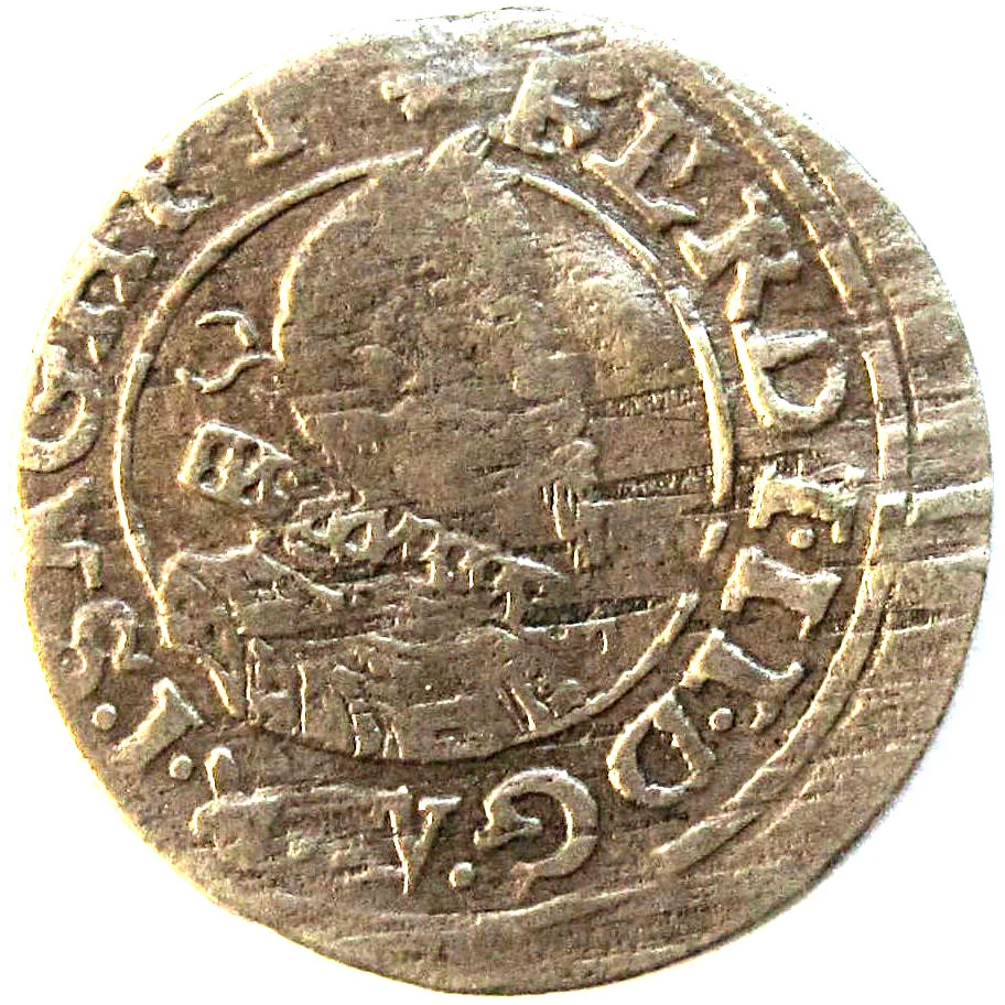 Portrait of Ferdinand II facing right in a ruffled collar. The mint mark (CW linked or B) divides the legend below.