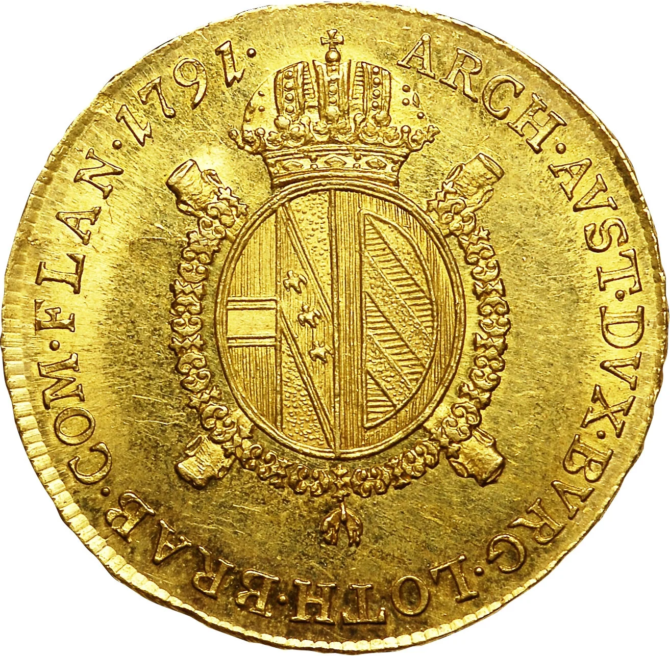 Shield with Austria-Lorraine-Burgundy arms, crowned and encircled by the Golden Fleece collar. Date in legend.