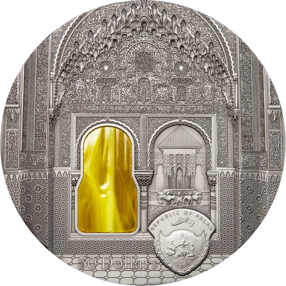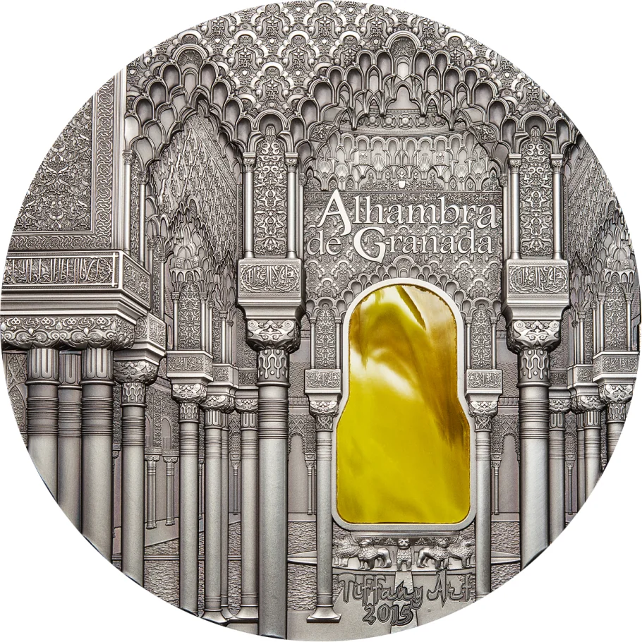 Nasrid-style Alhambra Palace in Granada with yellow stained glass.