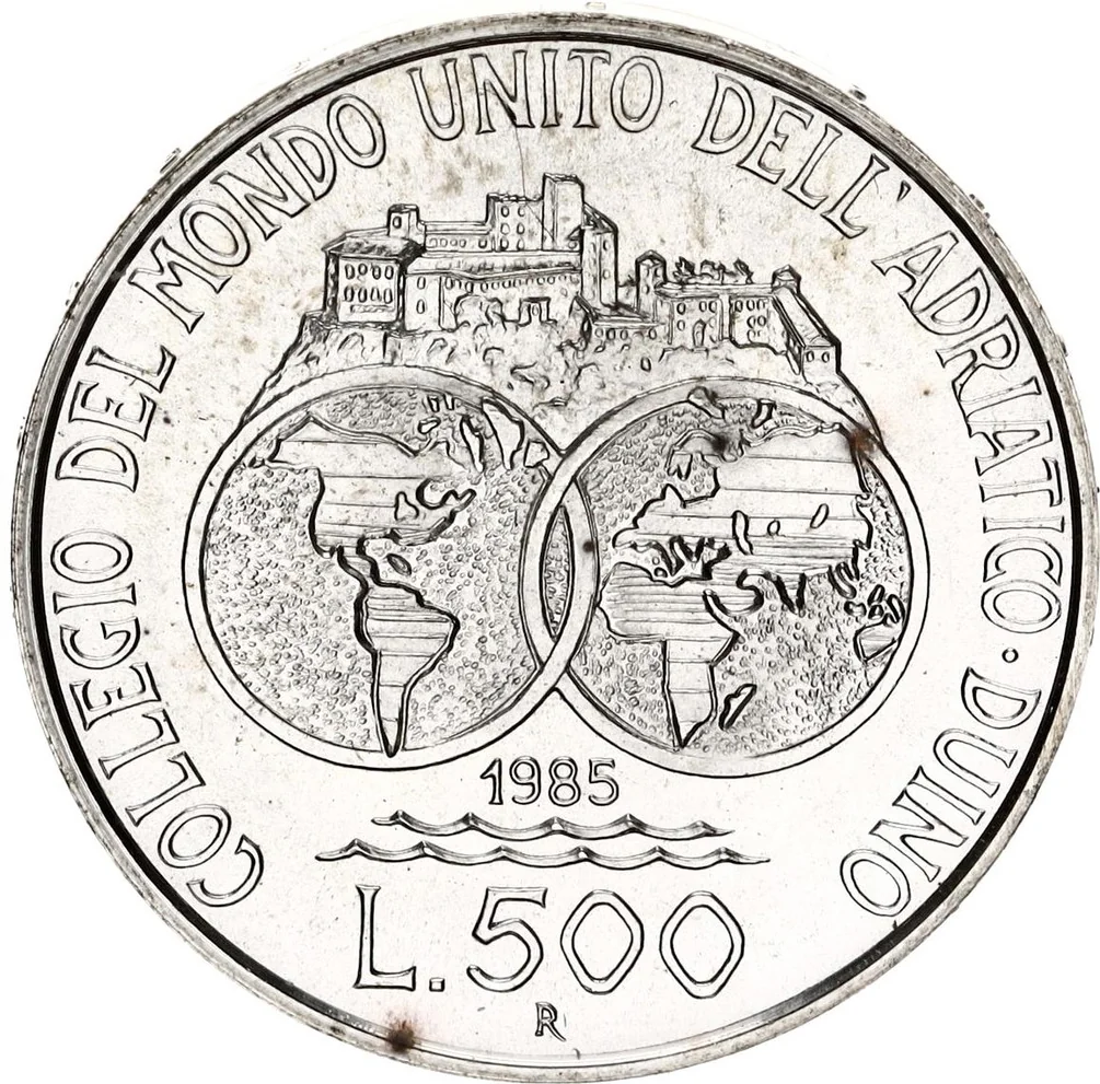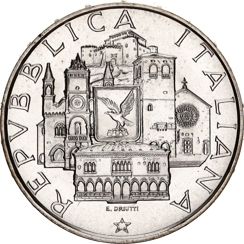 Description: The Friuli-Venezia Giulia coat of arms, encircled by depictions of the Loggia del Lionello (Udine), Town Palace of Pordenone, Basilica di San Giusto (Trieste), and Gorizia Castle. Below, the engraver's name and a star.