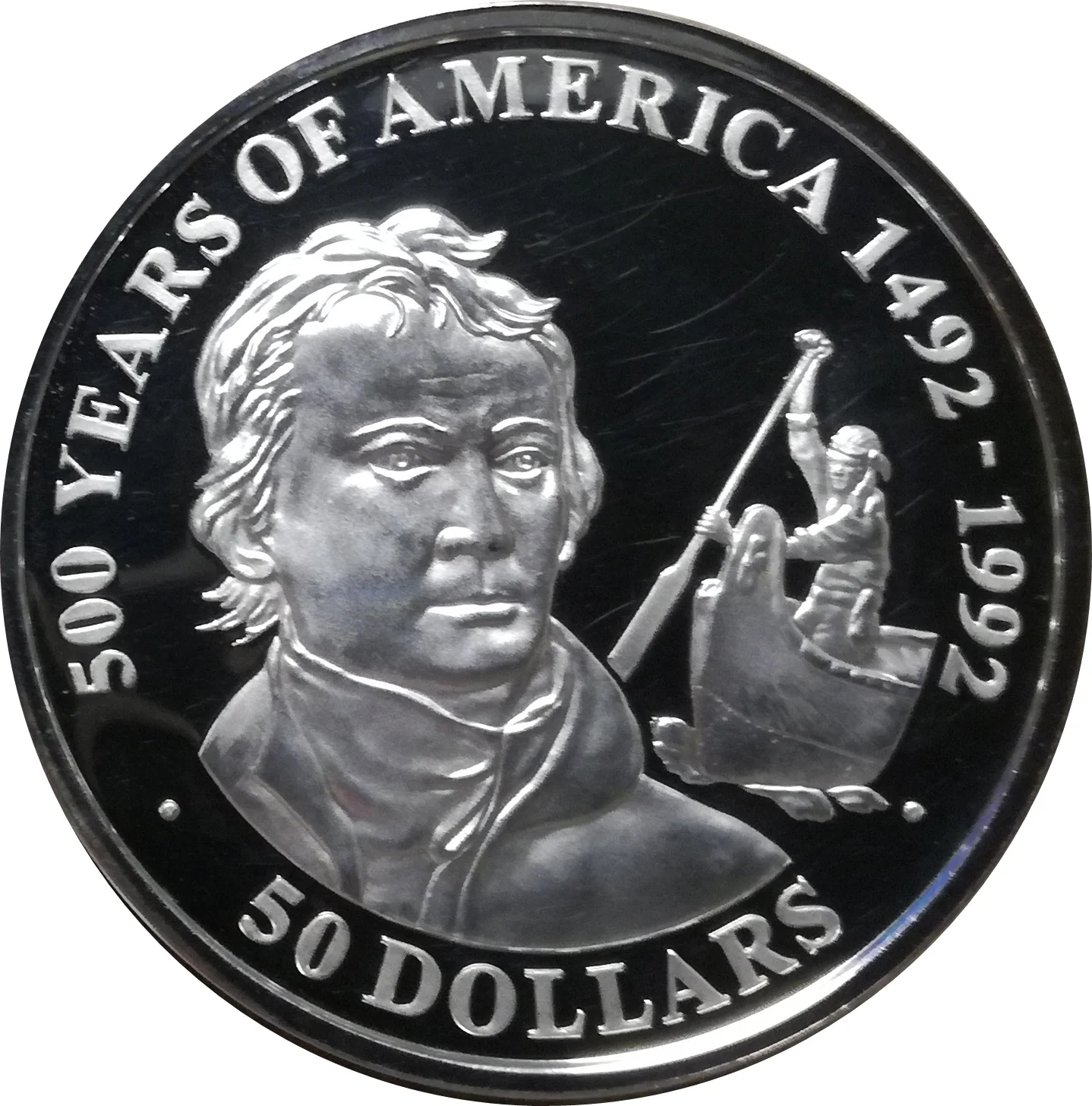 Left, Alexander Mackenzie's bust facing right; a canoe at his side. Denomination below.