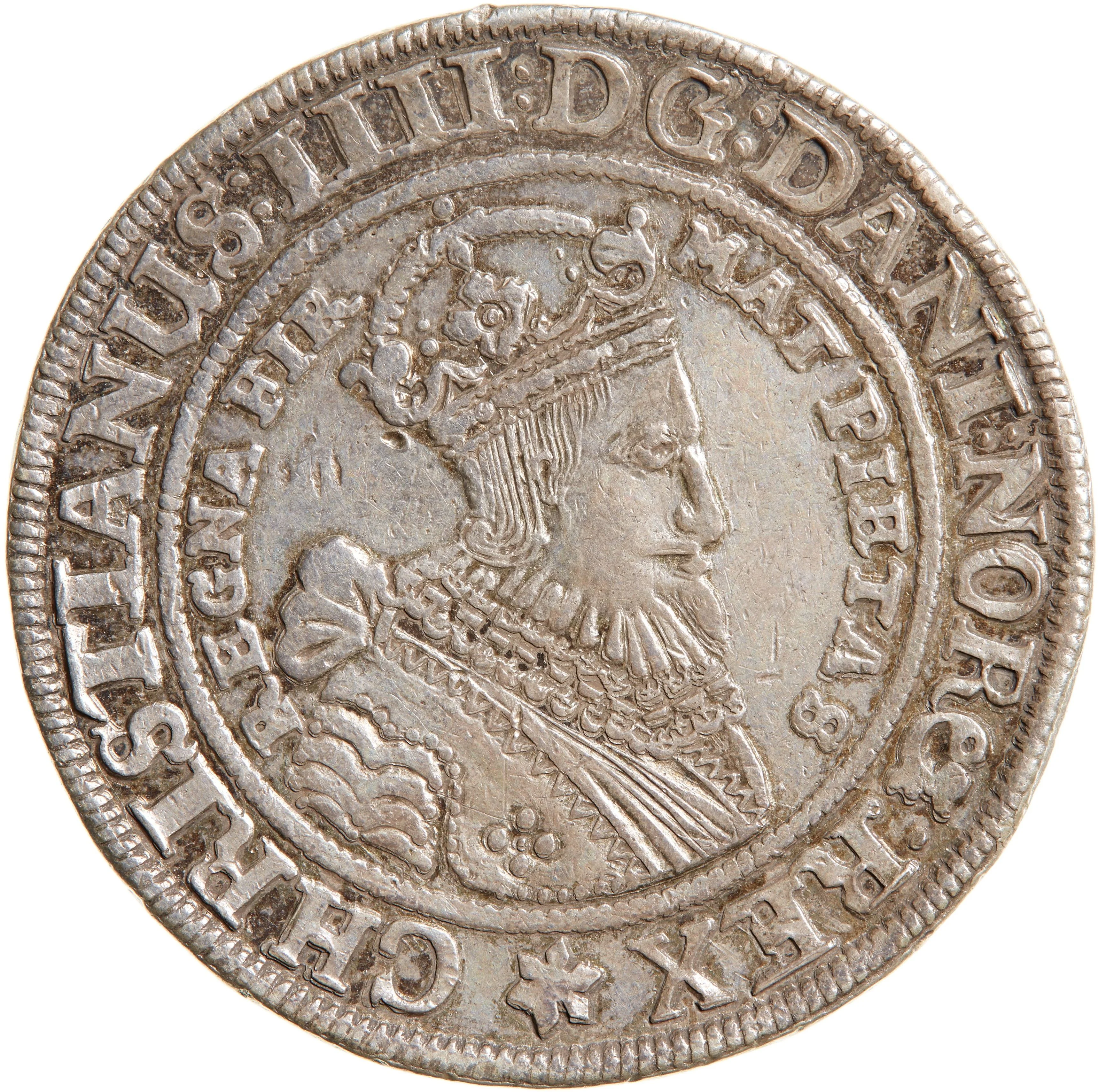 Right-facing crowned bust of Christian IV in high collar, within beaded circle and inscription. Outer legend and beaded edge.