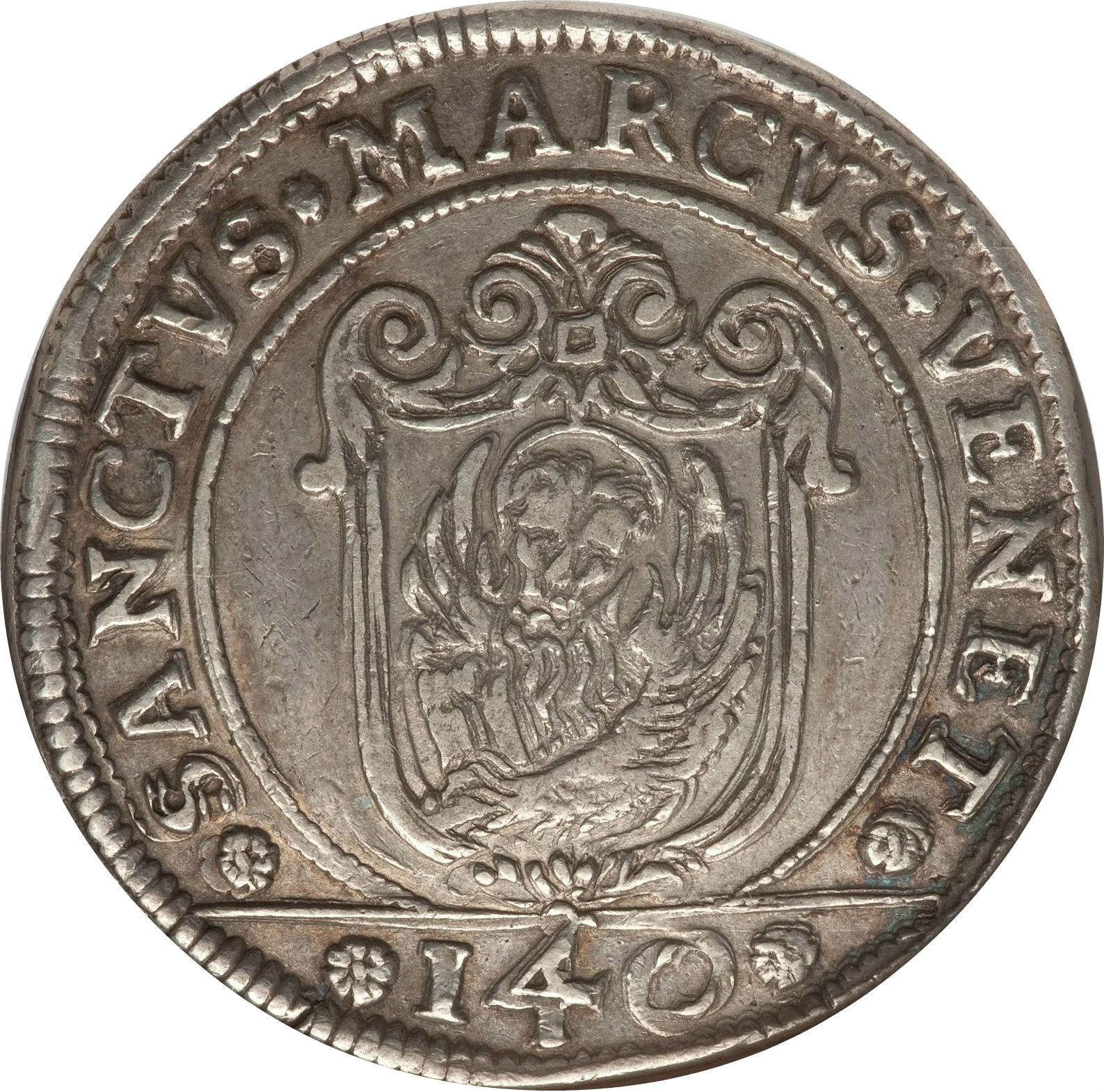 Lion of St. Mark in ornate shield, '140' below.