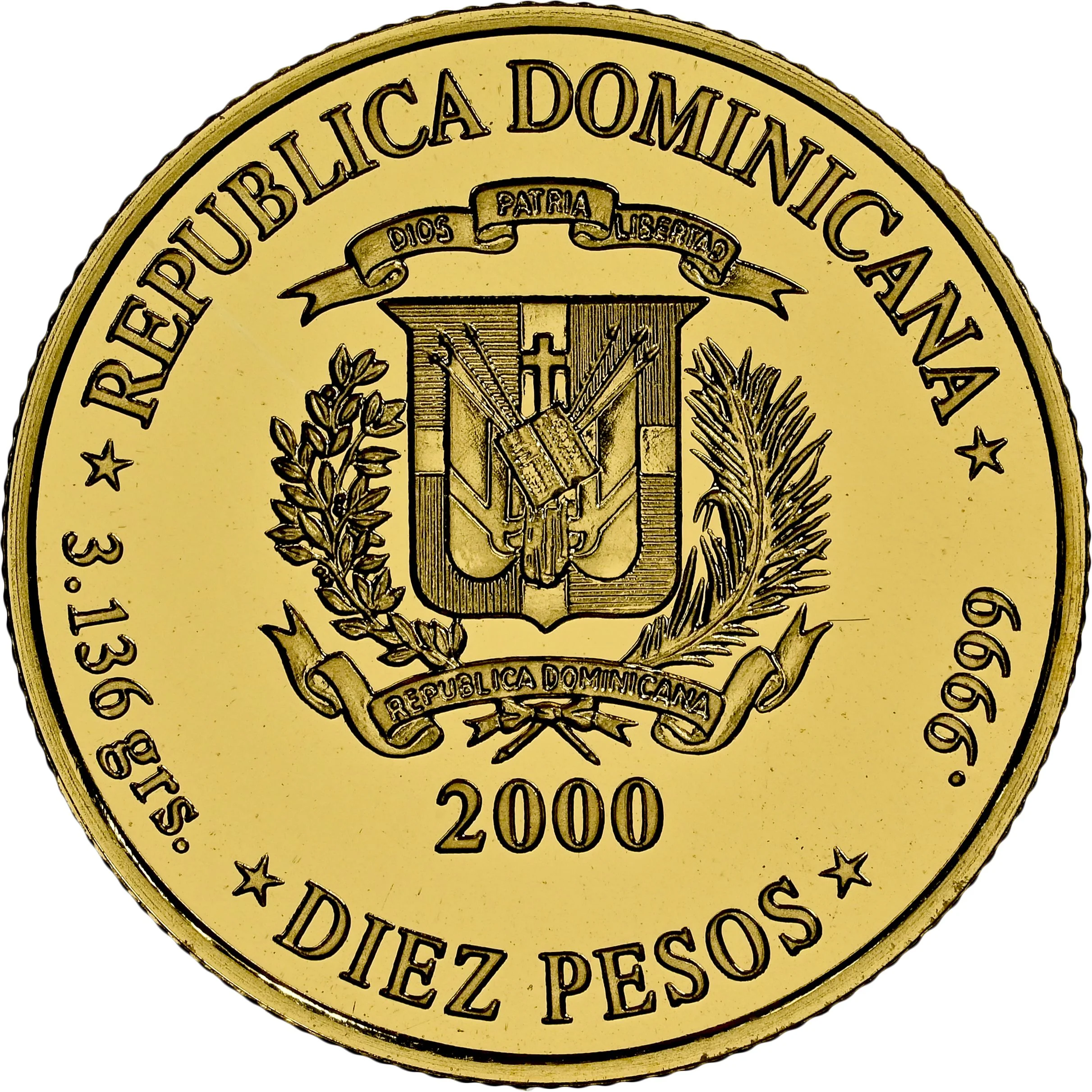 Issuer above coat of arms. Weight, year, value, and fineness below.