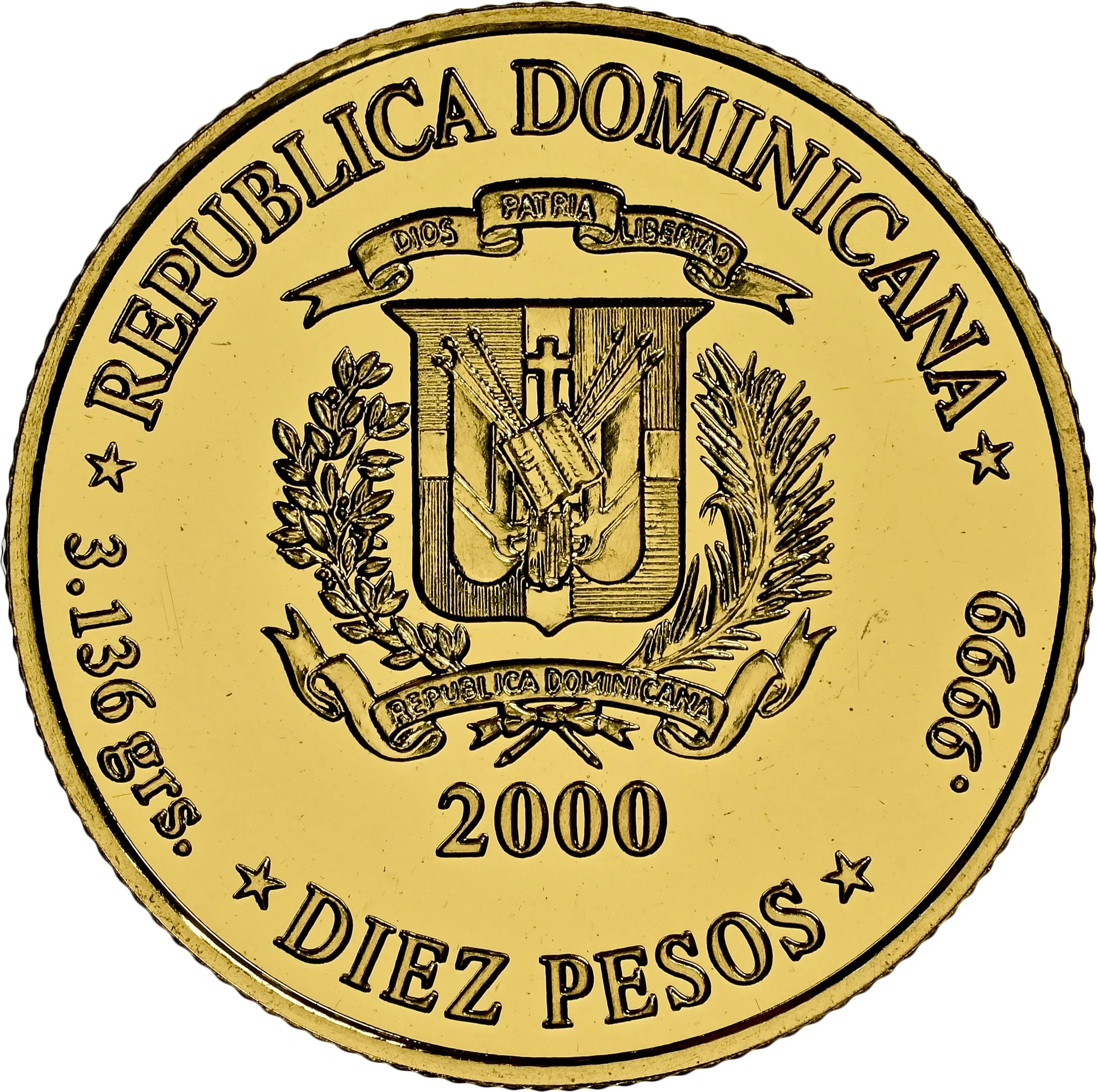 Issuer above coat of arms. Weight, year, value, and fineness below.