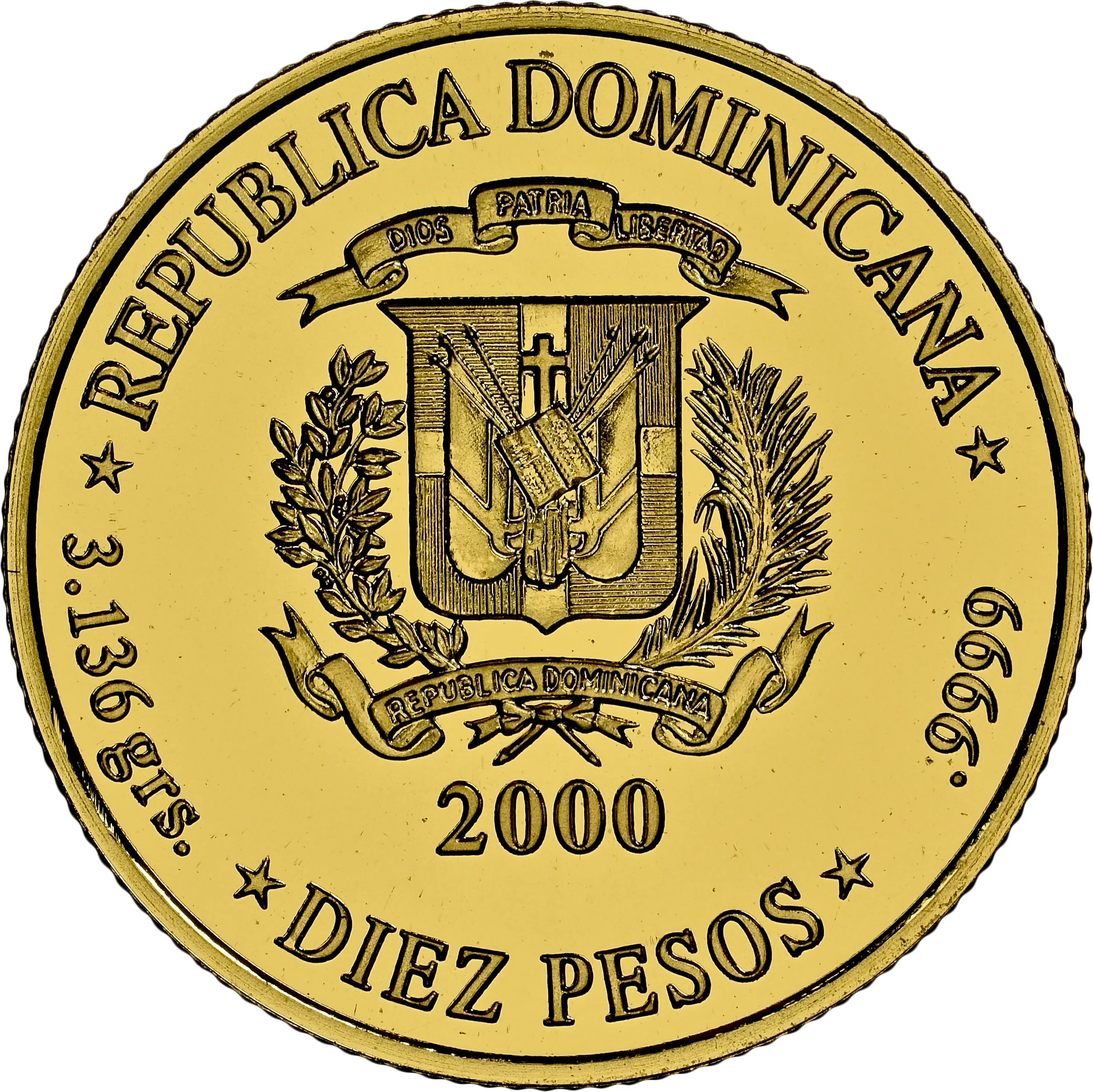 Issuer above coat of arms. Weight, year, value, and fineness below.