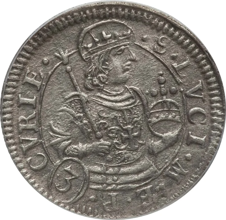 Half-length crowned Saint Lucius facing right, holding orb and scepter in circle; value in oval below.