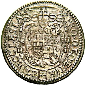 Arms with fourfold shield, cardinal's hat above dividing date.