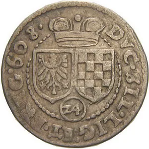 Two shields: Silesian eagle and Brieg arms. Crown above, 'Z$' in oval below, date in legend.