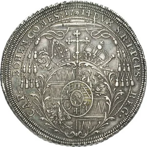 Cardinal's hat over cross dividing mitre and crown, arms below, date split by star.