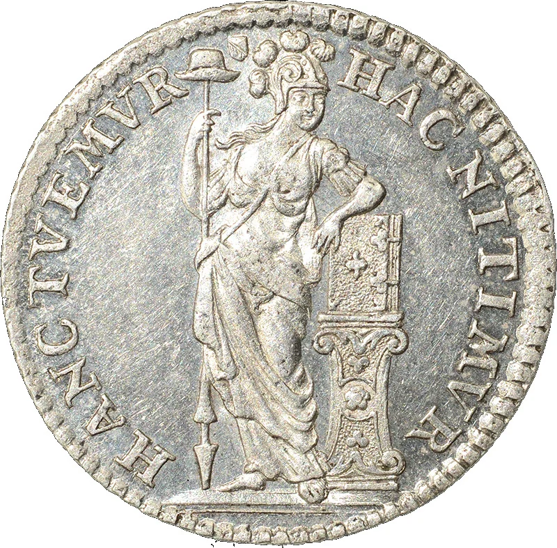 Liberty-capped female figure leaning on a spear, her arm resting on a column with a charter.