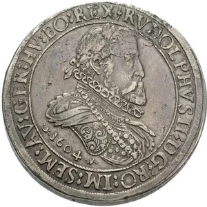 Bust of Rudolf II in ornate armor and ruffled collar, facing right within a braided circle; date below, legend begins at 1 o'clock.