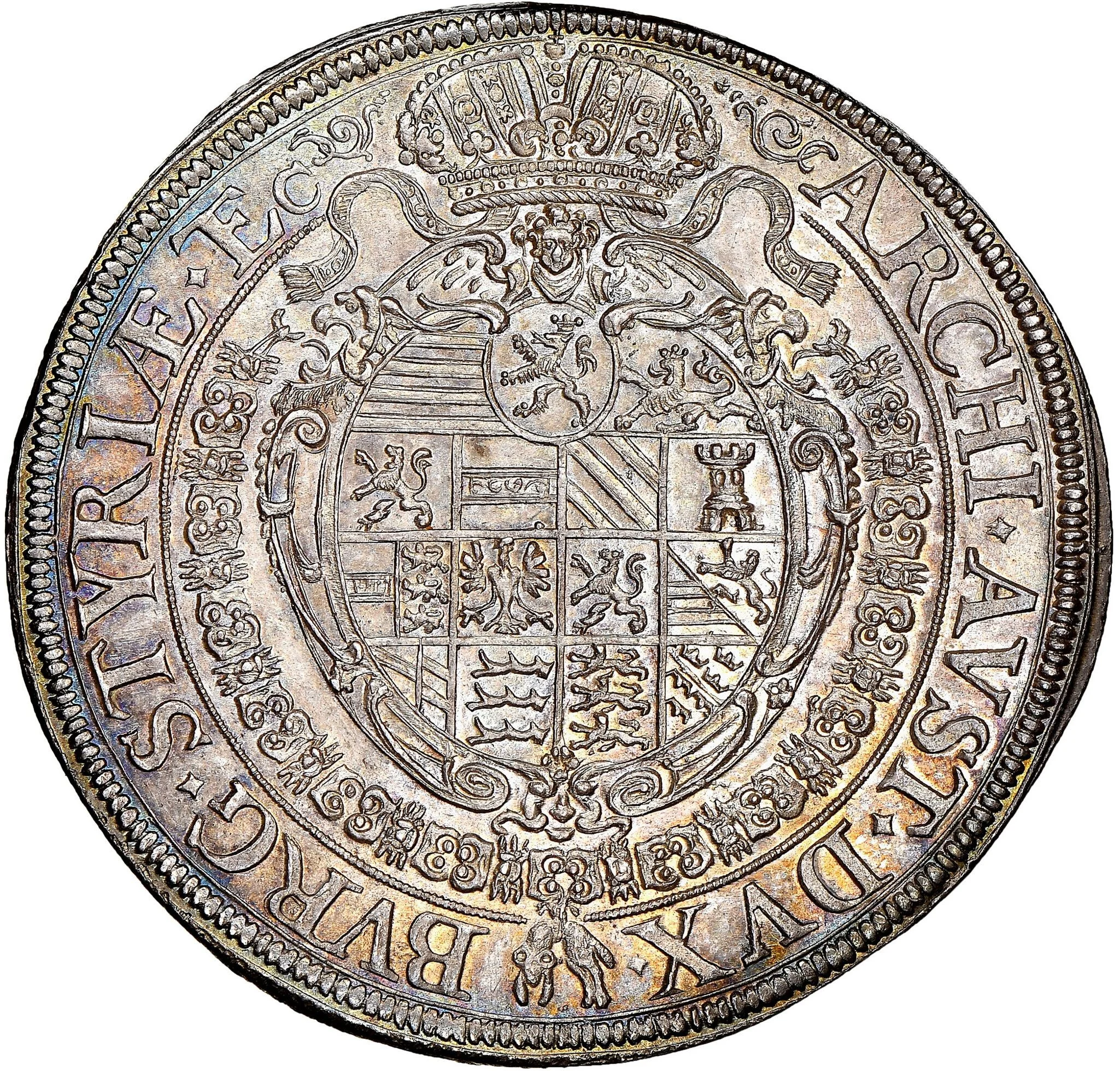Arms in an oval shield, crowned and encircled by the Golden Fleece chain, with a small Styrian panther shield above. The crown breaks the surrounding circle and legend.
