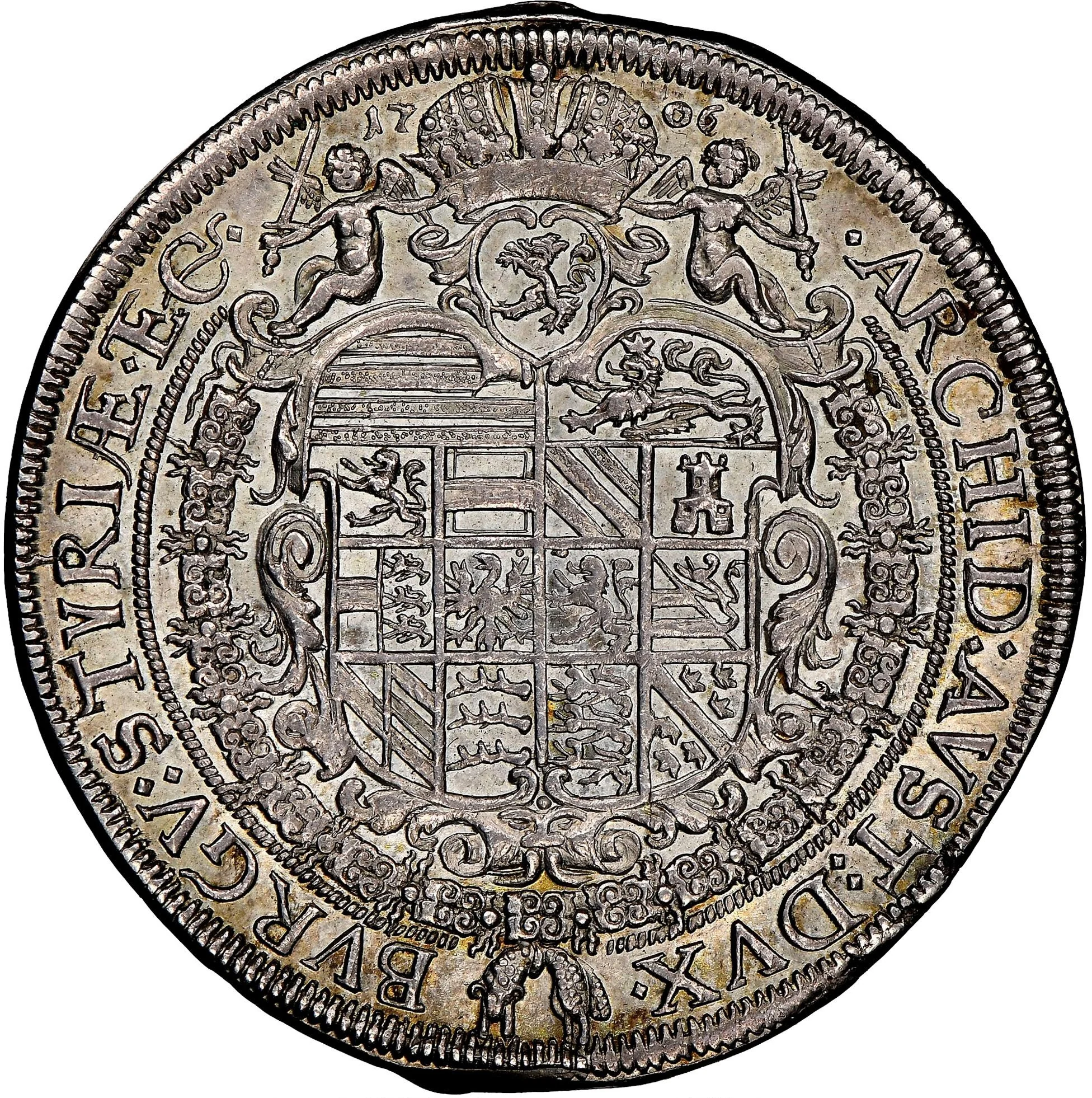 Composite arms with baroque ornamentation. Above, a small Styrian shield, two angels, and a crown dividing the date. Legend begins at 1 o'clock.